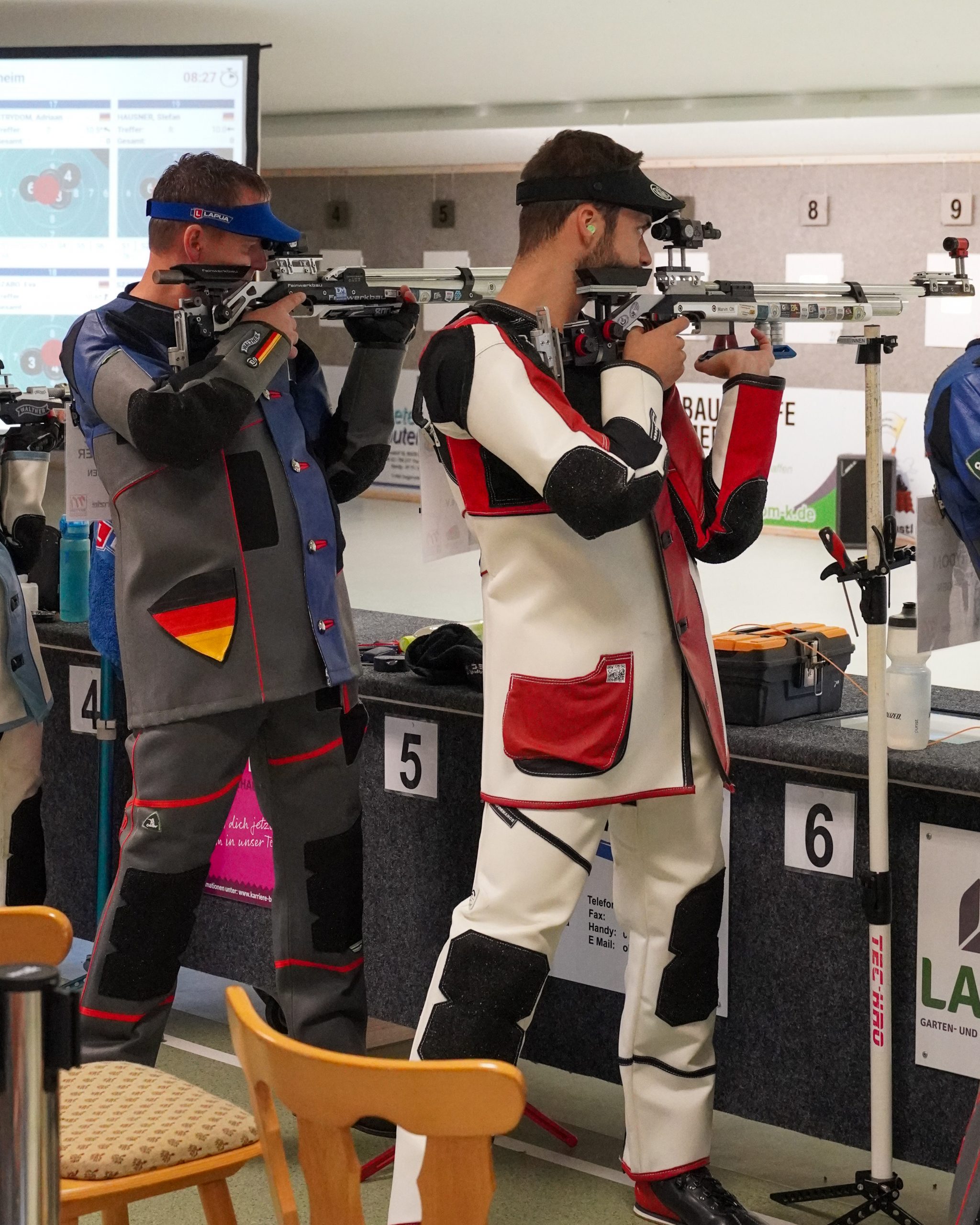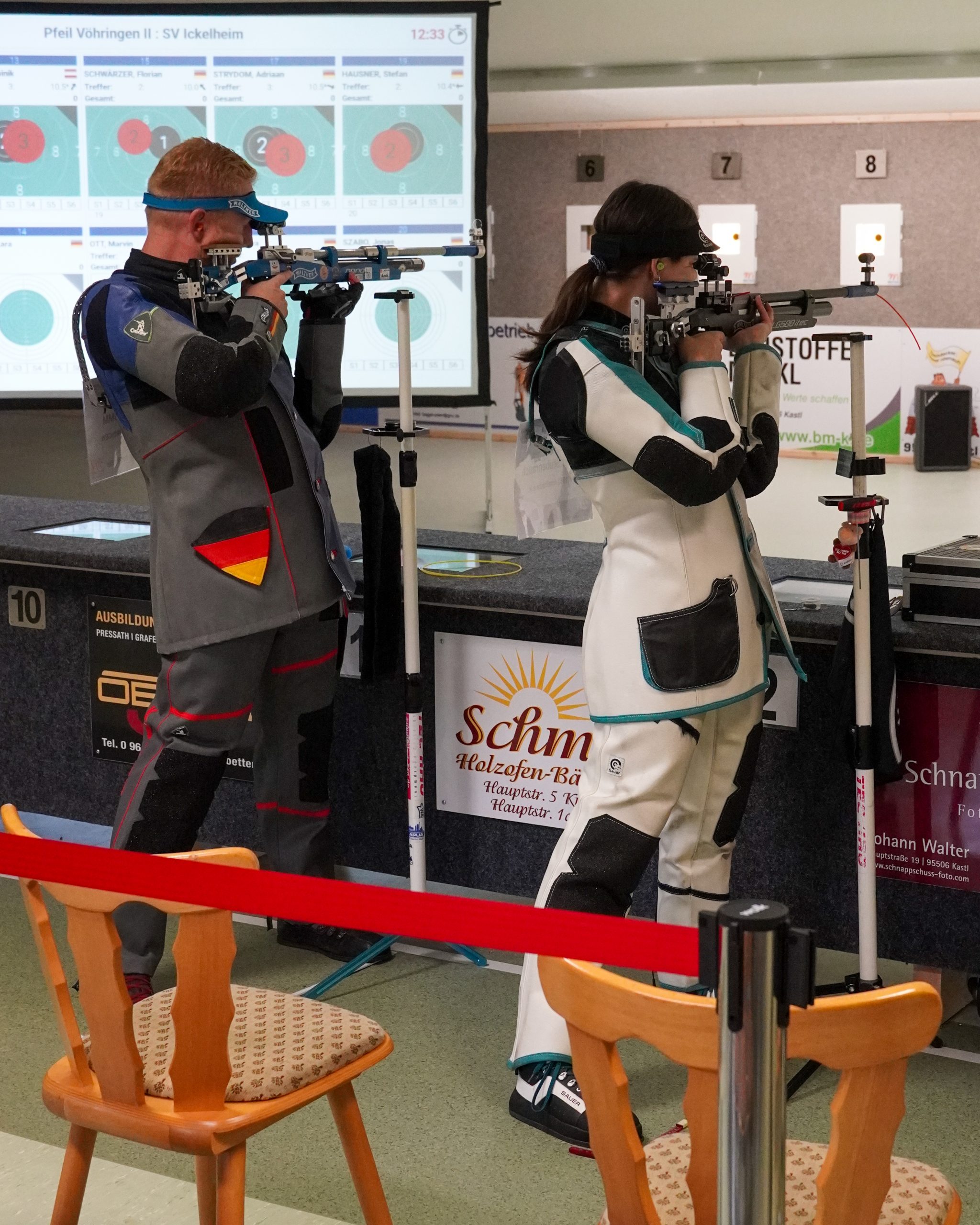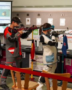 Auf der Eins konnte sich Hanna um 2 Ringe steigern, hatte aber mit 392:399 erneut das Nachsehen. Marvin und Jonas kamen nicht so recht in den Wettkampf, bei ihren Gegnerinnen lief es hier deutlich besser. Mit 389:395 bzw. 385:393 mussten beide ihre Punkte abgeben. Ihre tolle Form aus der Vorbereitung bestätigte Lara Engler. Mit 396 Ringen setzte sie sich eine neue Liga-Bestleistung und gewann (gegen 393 Ringe) auch ihren Punkt. Zwischenzeitlich etwas gestrauchelt hatte Eva. Am Ende brauchte es noch eine 100er-Serie um sich mit 391 Ringen ins Stechen retten zu können. Dort trumpfte sie mit einer 10,9 auf und gewann den zweiten Einzelpunkt.
