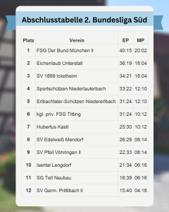 Mit 18:4 Mannschaftspunkten sowie 34:21 Einzelpunkten belegt unsere Mannschaft damit Platz 3 der 2. Bundesliga Süd. Da „Der Bund München 2“ nicht aufstiegsberechtigt ist, geht der zweite Relegationsplatz an uns.