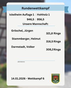 Einen neuen Vereinsrekord hat Jürgen Gröschel im Wettkampf gegen Hohholz 1 erzielt. Seine 321,8 Ringe konnten die Niederlage unserer Ersten Auflagemannschaft jedoch nicht verhindern, mit 956,5:946,5 Ringen ging der Wettkampf an den Tabellenführer.