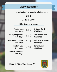 In der Gauoberliga stand für unsere Vierte Mannschaft noch der letzte Wettkampf der Vorrunde an. Im Wettkampf gegen Langenstein wurden die Einzelpunkte mit 2:2 geteilt, wobei der dritte Mannschaftspunkt mit 1440:1445 den Gästen überlassen werden musste.