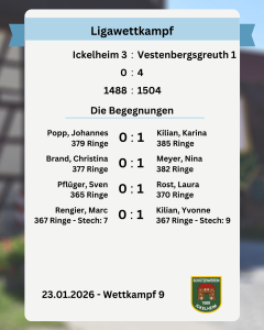 Eine weitere Niederlage musste unsere Dritte Mannschaft in der Bezirksliga hinnehmen. Beim Heimkampf gegen Vestenbergsgreuth 1 hatte Marc Reniger noch die Chance, im Stechen einen Ehrenpunkt zu gewinnen, aber auch hier war uns das Glück nicht hold. Am Ende gewannen die Gäste, bei 1488:1504 Ringen, alle 4 Einzelpunkte.