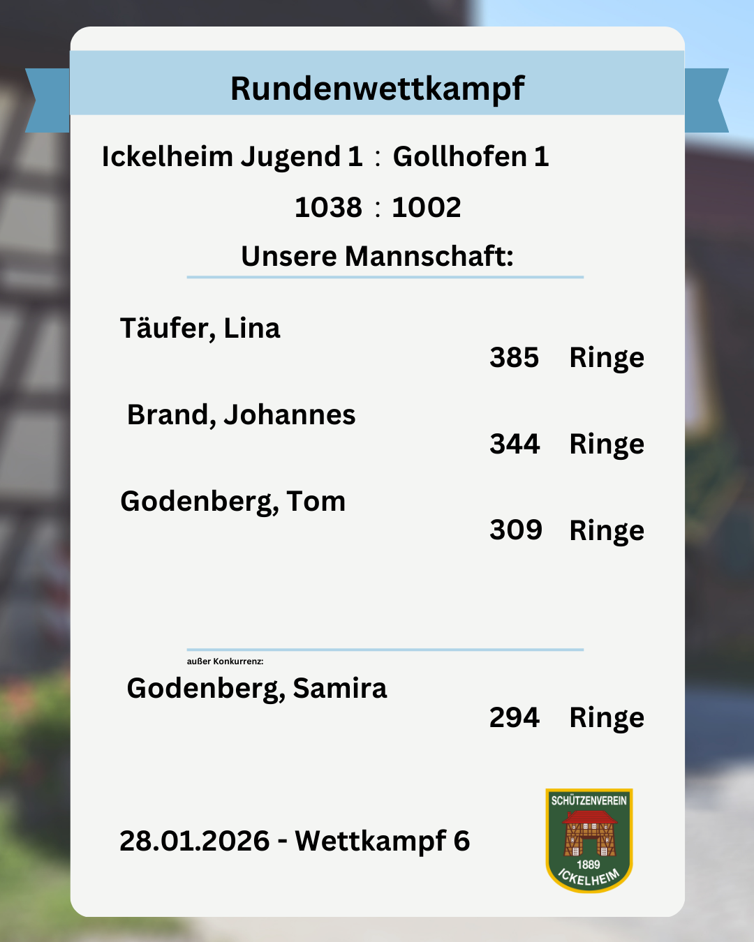 Zum ersten Wettkampf nach der Winterpause empfing unsere Erste Jugendmannschaft die Erste aus Gollhofen. Mit 1038:1002 konnte der Wettkampf mit sicherem Abstand gewonnen werden.