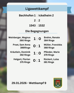 Zur „ringmäßig“ stärksten Mannschaft der Bezirksoberliga, Bechhofen 1, führt der Wettkampfplan unsere Zweite Mannschaft. In einem hochklassigen Match kam es am Ende, bei 2:2 Einzelpunkten, zur Punkteteilung, bei 1543:1532 ging der dritte Mannschaftspunkt an die Gastgeber.