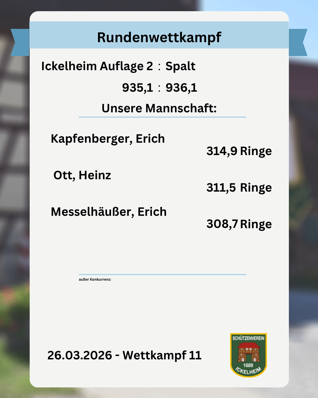 Aus jeder Bezirksoberliga-Auflage muss sich unsere 2. Auflagemannschaft zur kommenden Runde wohl verabschieden. Als Tabellenschlusslicht stand nur der Wettkampf gegen das vorletzte Team an. Mit 936,1 : 935,1 konnte sich Spalt 1 knapp durchsetzen und die Punkte gewinnen. Für unser Team besteht jetzt, mit einem Rückstand von 6 Punkten, nur noch eine rechnerische Chance auf den Klassenerhalt.
