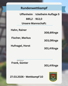 Erfolgreich beendet hat unsere 5. Auflagemannschaft ihre Premierensaison. Mit 913,0 zu 885,2 Ringen konnte der letzte Wettkampf gegen Uffenheim klar gewonnen werden. Mit 10:4 Punkten konnte der 2. Tabellenplatz erzielt werden, lediglich gegen die Mannschaft aus Neustadt musste sich das Team zweimal geschlagen geben.
