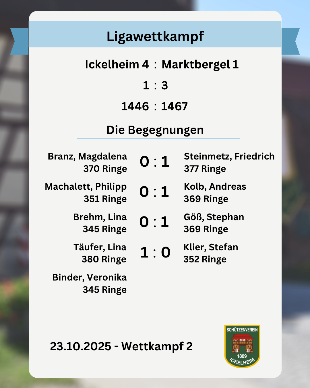 Den Auftakt machte am Donnerstag unsere Vierte Mannschaft im Heimkampf gegen Marktbergel 1. Die Mannschaft unseres Patenvereins gehört zu den stärkeren Teams der Gauoberliga und ist aktuell Tabellenführer. Hier war bereits im Vorherein die Devise ausgerufen worden, dass es in erster Linie um das Sammeln von Erfahrungen geht. Mit 3:1 und 1467:1446 Ringen gingen die Mannschaftspunkte letztlich auch an die Gäste.