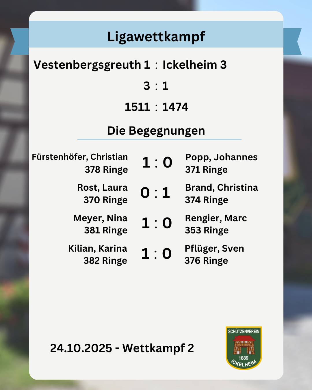 Am Freitag reiste unsere Dritte Mannschaft nach Vestenbergsgreuth. Am ersten Wettkampftag hatten die Greuther mit einem Top-Ergebnis von 1545 Ringen aufgetrumpft. Dieses Ergebnis konnten sie zwar nicht wiederholen, mit 1511:1474 Ringen und 3:1 Punkten gewannen sie den Wettkampf jedoch klar. Den Ehrenpunkt sicherte sich Christina Brand mit 374 Ringen.