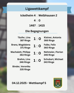 Immer mehr in Fahrt kommt unsere Vierte Mannschaft. Nach dem 4:0 gegen Lenkersheim vor 2 Wochen, folgte jetzt ebenfalls ein 4:0 gegen Welbhausen 2. Mit 1467 Ringen konnte zudem ein neuer Mannschaftsrekord aufgestellt werden.