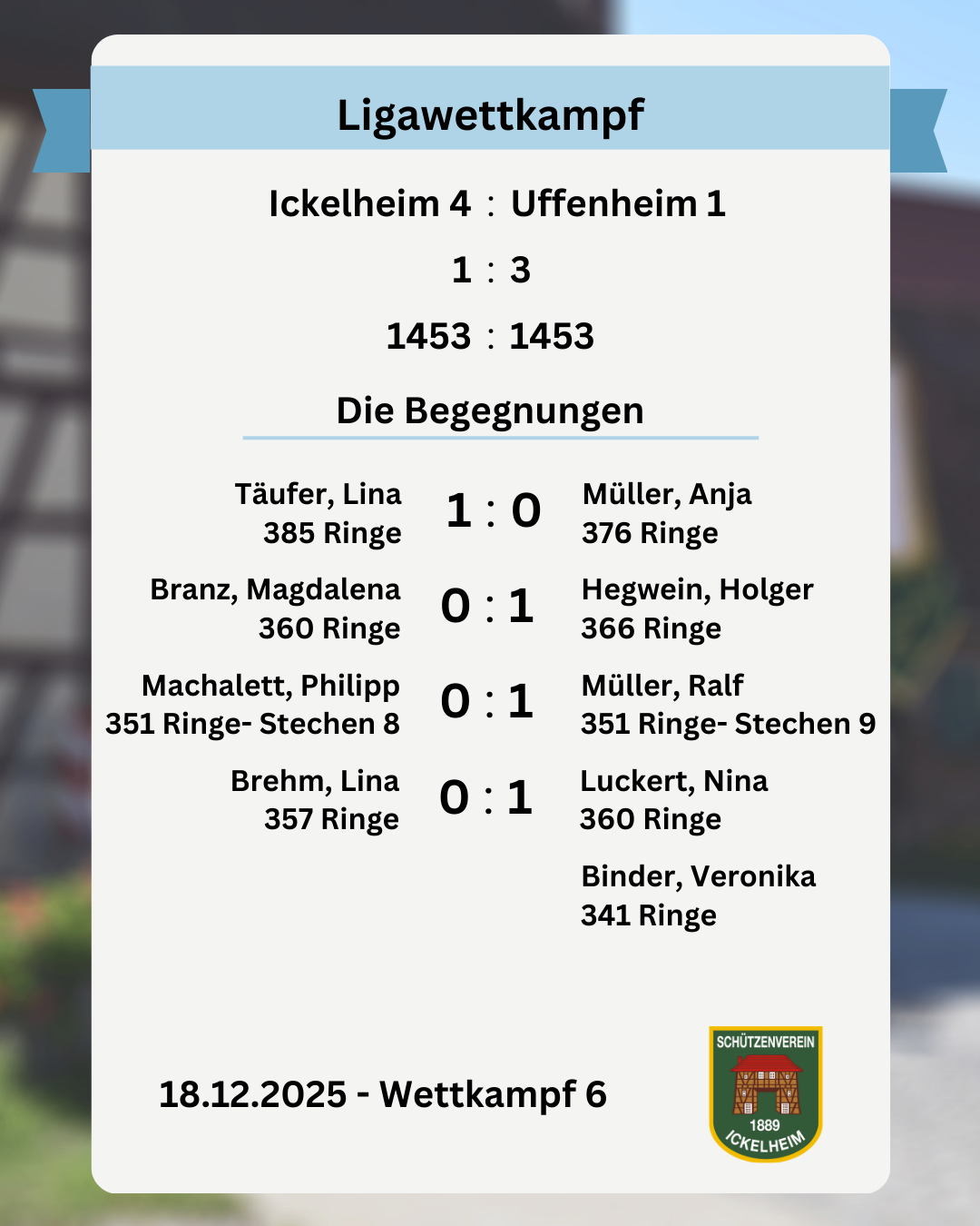 Am 6. Wettkampftag der Gauoberliga begrüßte unsere Vierte Mannschaft Uffenheim 1. Dieser Wettkampf sollte sich zu einem richtigen Fight entwickeln. Partie 1 hatte Lina Täufer mit 385 Ringen, dem besten Ergebnis des Wettkampfs, schnell im Griff. In den drei weiteren Partien gab es etliche Führungswechsel. Nachdem Magdalena Branz und Lina Brehm ihre Punkte abgegeben hatten, oblag es Philipp Machalett, noch die letzte Chance auf einen Mannschaftspunkt zu wahren. Mit konzentrierten letzten Schüssen gelang es ihm, sich noch ins Stechen zu retten. Mit 1:2 für Uffenheim, bei 1453:1453 Ringen ging es nur ins Stechen. Der Stechschuss sollte jedoch, mit dem knappestmöglichen Ergebnis an die Uffenheimer gehen, lediglich 0,1 Ringe trennten die Stechschüsse. Jedoch mit 8,9:9,0 auf Ganze Ringe dann doch ein Ring. Somit gehen die 3 Mannschaftspunkte komplett nach Uffenheim.