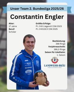 Constantin ist mit 17 Jahren das jüngste Mitglied der Mannschaft und ist Schüler. Basketball, Zocken und Laufen sind neben dem Schießen seine Hobbies. Mit seiner Schwester Lara bildet er das zweite Geschwister-Duo der Mannschaft.