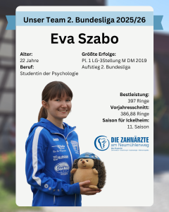 Eva ist 22 Jahre alt und Studentin der Psychologie. Neben dem Schießen liest sie gerne und ist Bezirksjugendsprecherin des Mittelfränkischen Schützenbunds.