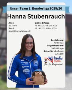 Hanna ist 20 Jahre alt und macht aktuell die Ausbildung zur Chemielaborantin. Neben dem Schießen zählt sie Kraftsport und Lesen zu ihren Hobbies.