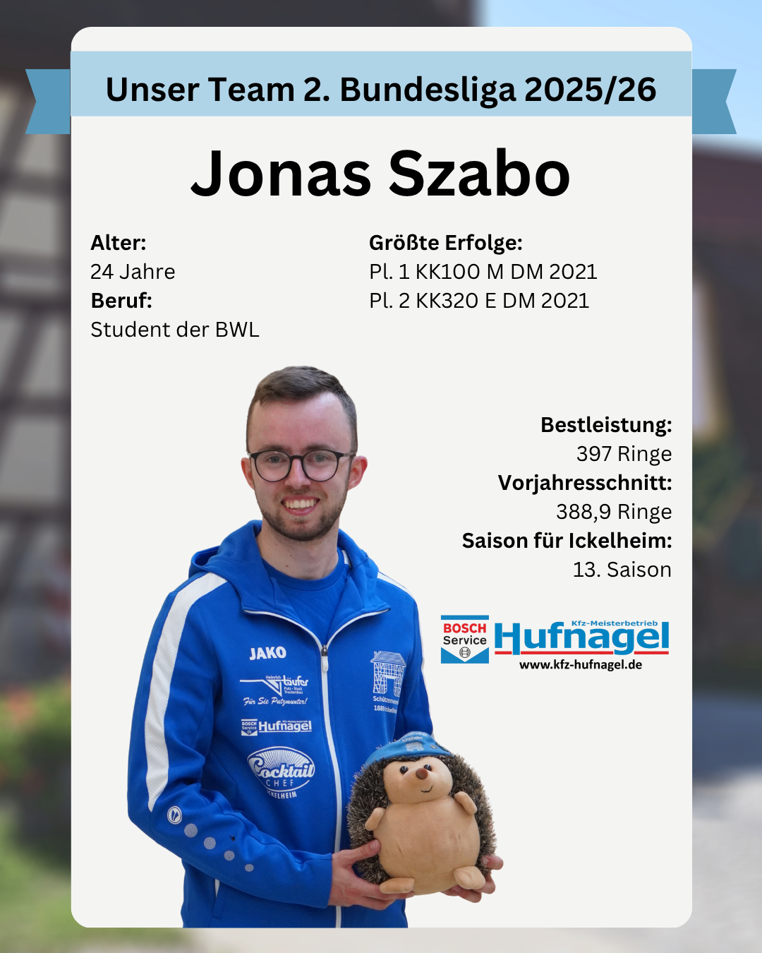 Jonas ist 24 Jahre alt und studiert Betriebswirtschaftslehre. Neben dem Lesen zählt er Joggen und Zocken zu seinen Hobbies. Wie seine Schwester ist auch er Jugendsprecher des Mittelfränkischen Schützenbundes.