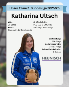 Katharina geht in die 6. Saison für den SV 1889 Ickelheim. Neben dem Aufstieg in die sowie der Vizemeisterschaft in der 2. Bundesliga gehört die Deutsche Vizemeisterschaft im Luftgewehr 3-Stellungskampf mit der Mannschaft 2021 zu ihren größten Erfolgen.