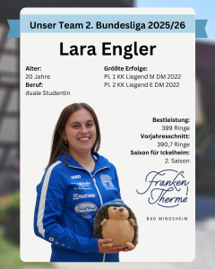 Lara geht in ihre 2. Saison für den SV 1889 Ickelheim. 2022 wurde sie, in der Einzelwertung, Deutsche Vizemeisterin im KK Liegend und gewann zudem mit der Mannschaft, mit neuem Deutschen Rekord, die Deutsche Meisterschaft. Ihr schönstes Erlebnis ist es für Ickelheim schießen zu dürfen.