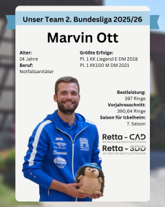 Marvin geht in die 7. Saison für den SV 1889 Ickelheim. Neben dem Aufstieg in die sowie der Vizemeisterschaft in der 2. Bundesliga gehört der Gewinn der Deutschen Meisterschaft im KK-Liegend, in der Einzelwertung, 2018 zu seinen größten Erfolgen