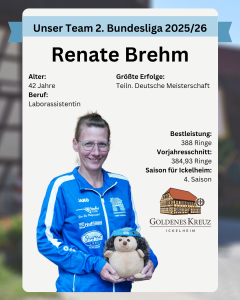 Obwohl Renate erst spät mit dem Schießen begonnen hat, stehten schon eine Wettkampfbestleistung von 388 Ringen sowie eine Trainingsbestleistung von 393 Ringen zu Buche. Dieses Jahr schaffte sie, als erste Dame des SV Ickelheim die nicht für RWS-Franken startet, den Sprung zur Deutschen Meisterschaft. Als Captain führt sie unsere Zweite Mannschaft in der Bezirksoberliga an und steht bei Vorbereitungswettkämpfen sowie als Reserve dem Bundesliga-Team immer zur Verfügung.