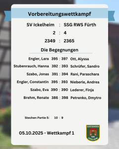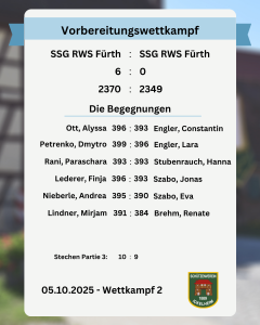 Zum dritten und letzten Vorbereitungswettkampf für die 2. Bundesliga-Saison konnten wir heute eine Mannschaft der SSG RWS Fürth (ehemals SSG Dynamit Fürth) begrüßen.